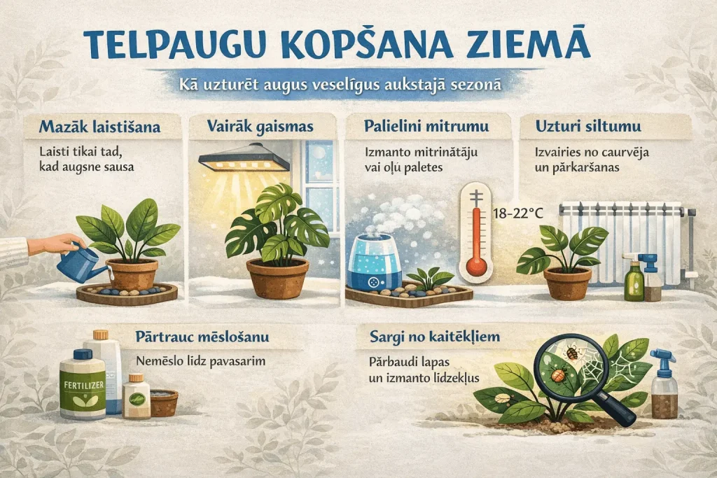 Ziemas mēneši telpaugiem ir īsts pārbaudījums — mazāk gaismas, sausāks gaiss, temperatūras svārstības un apkures radītās problēmas. Lai augi šajā laikā saglabātu veselību un nezaudētu izskatu, ir svarīgi pielāgot kopšanu sezonālajām pārmaiņām. Šis raksts apvieno vadošo dārzkopības ekspertu (RHS, Proven Winners, NCSU Extension u.c.) ieteikumus, izveidojot profesionālu un praktisku ziemas kopšanas rokasgrāmatu.